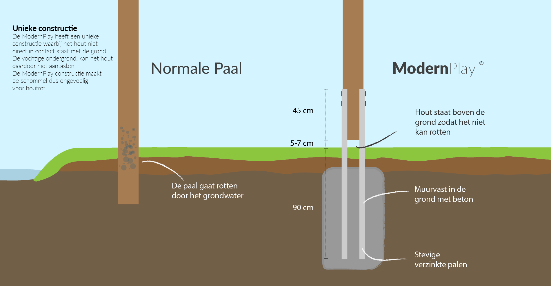 Daarom hebben wij een schommel ontwikkeld waarbij de veiligheid van de schommel het belangrijkste uitgangspunt is. Door de unieke verankering van de schommel is het onmogelijk dat het hout van de schommel gaat rotten. Bij de verbinding tussen de bovenbalk en de palen is ervoor gekozen om de bevestiging onder de bovenbalk te plaatsen. Dit voorkomt dat er water in de paal blijft zitten, en zodoende wordt de levensduur van het hout nóg langer.