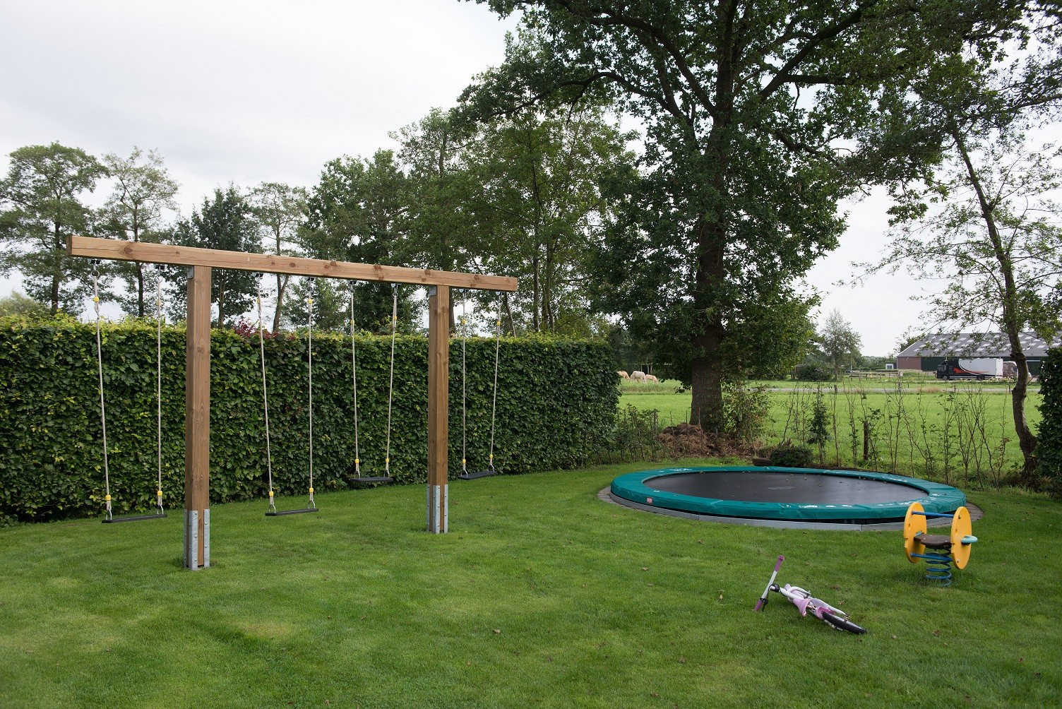 Dankzij de unieke bevestiging in de grond bespaart u ruimte, en krijgt de schommel een moderne uitstraling. De dikke, vierkante palen dragen daar uiteraard ook aan bij.